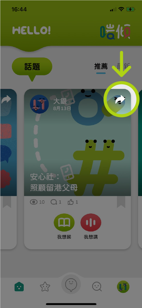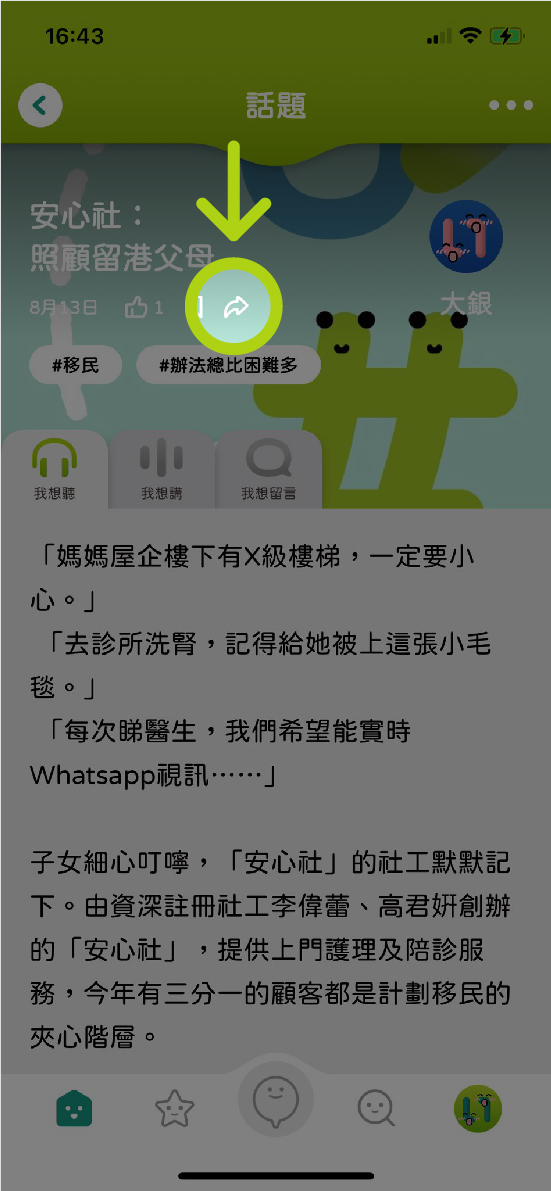 A:在話題主頁及內文,可按以下「分享」鍵,將心水內容傳遞予更多朋友。