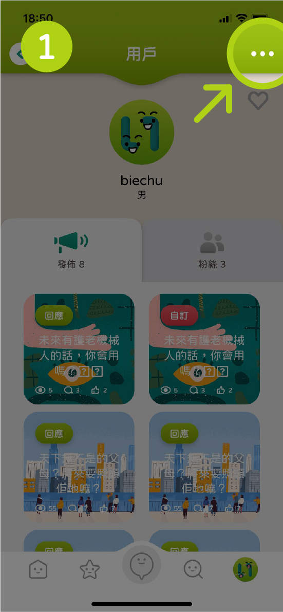 A:您可以按右下角的頭像,進入「我的花園」。按入「發佈」後,就會列出您曾發表或回應過的內容。